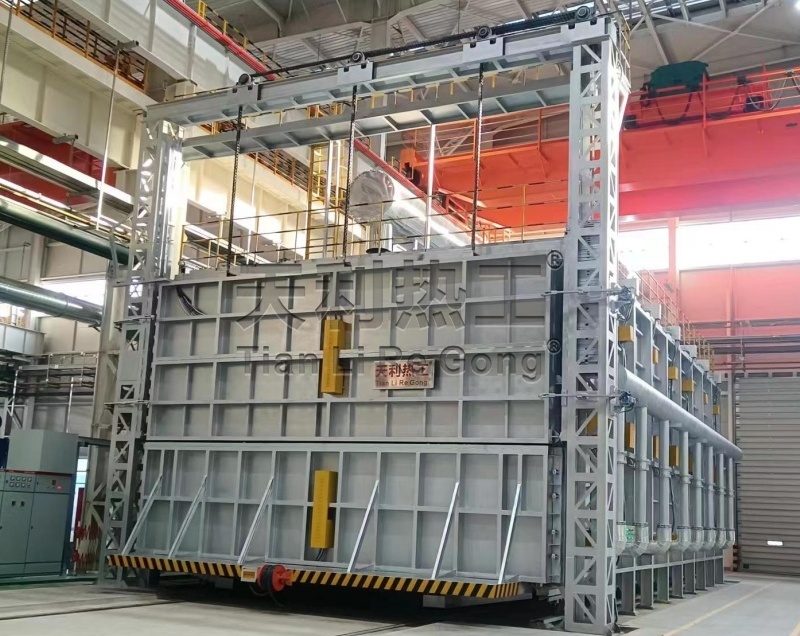 設(shè)備結(jié)構(gòu):本設(shè)備為臺車式熱處理爐,工件放置在內(nèi)筐內(nèi)部,通過由爐外工作臺驅(qū)動料架進(jìn)入到爐罐內(nèi),爐罐放置在臺車上。臺車帶動爐罐進(jìn)入到爐內(nèi)進(jìn)行熱處理。